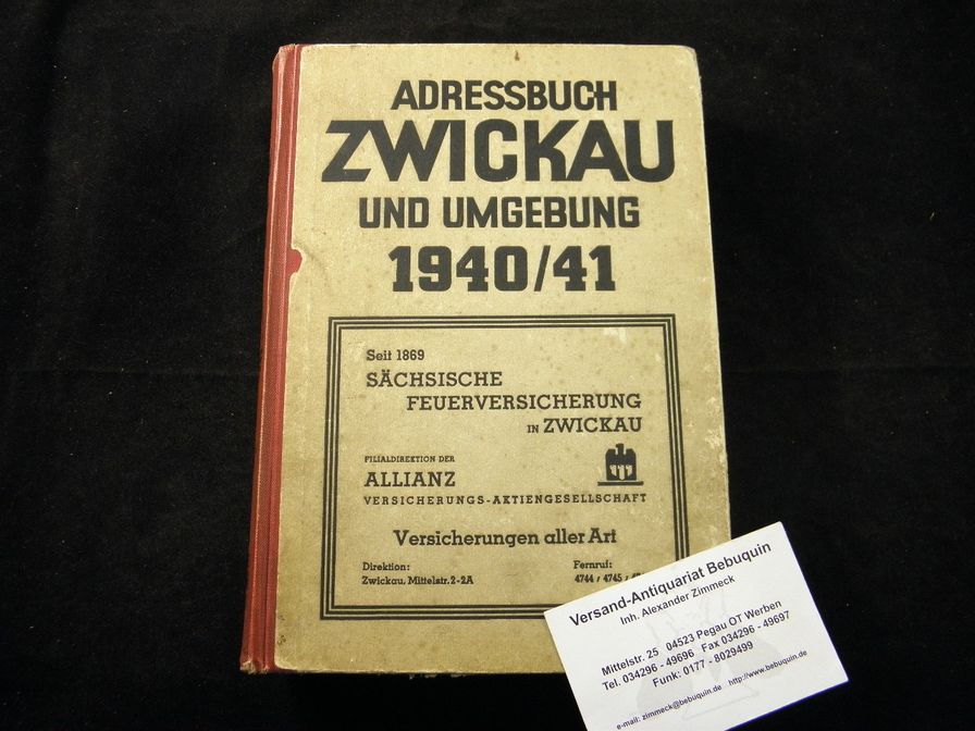 ZWICKAU.– ADRESSBUCH DER KREISSTADT ZWICKAU UND UMGEBUNG 1940/41.– 39. Aufl. Zwickau (Förster & Borries), 1940. XVI, 48, 264, 276, 286, 80 S. mit zahlr. Abb. und Plänen. ill. OHLn. leicht gebräunt, an den Kanten vereinzelt bestoßen, insgesamt gut erhalten. Umfangreiches Adressbuch mit den Gemeinden Wilkau-Haßlau, Friedrichsgrün, Hartenstein, Lichtentanne, Reinsdorf, Schönfels, Stenn, Wildenfels u.v.a.
