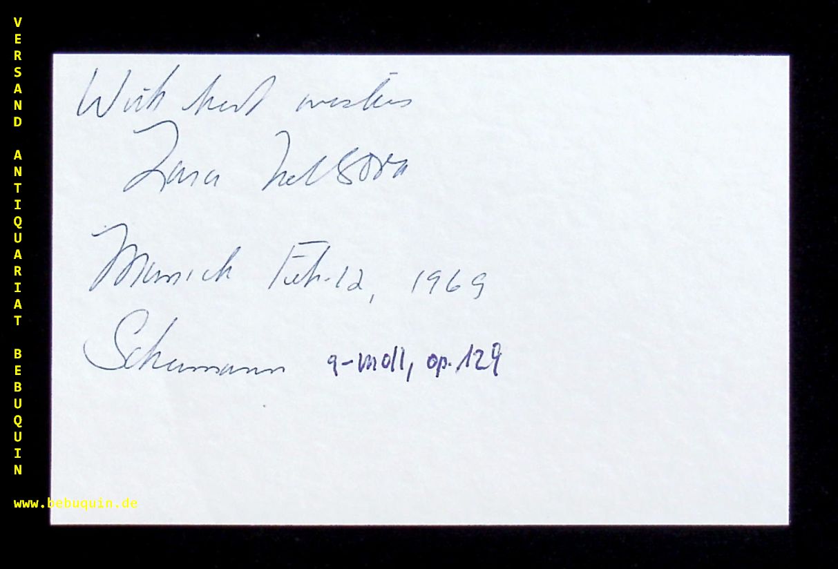 NELSOVA, Zara (Cellistin): eigenhändig signierte und datierte Autogrammkarte. München (Philharmonie), 12.2.1969. 8 x 12,5 cm. Karteikarte. Zara Nelsova (geborene Sarah Katznelson; * 23. Dezember 1918 in Winnipeg, Manitoba, Kanada; † 10. Oktober 2002 in Manhattan, New York) war eine klassische Cellistin. (Wikipedia)