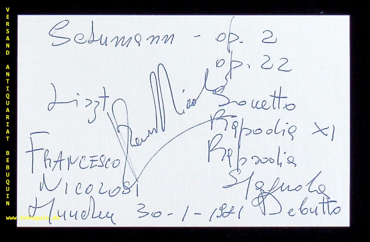 NICOLOSI, Francesco (Pianist): eigenhändig datierte und signierte Autogrammkarte mit eigenhändiger detaillierter Programmbeschreibung. München (Philharmonie), 30.1.1981. 8 x 12,5 cm. Karteikarte.