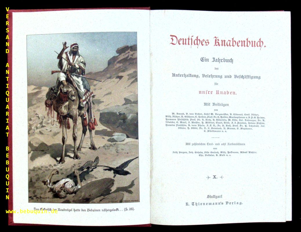 DEUTSCHES KNABENBUCH.– Bd. 10. Ein Jahrbuch der Unterhaltung, Belehrung und Beschäftigung für unsere Knaben. Stuttgart (Thienemann), (1898). Gr. 8°. 400 S., mit zahlr. Text- und 8 Farbenbildern von Fritz Bergen, Joh. Gehrts, Gerlach, Wald, Chr. Votteler u.a. farb. ill. OLn. Rücken leicht knitterig, sonst gut erhalten.