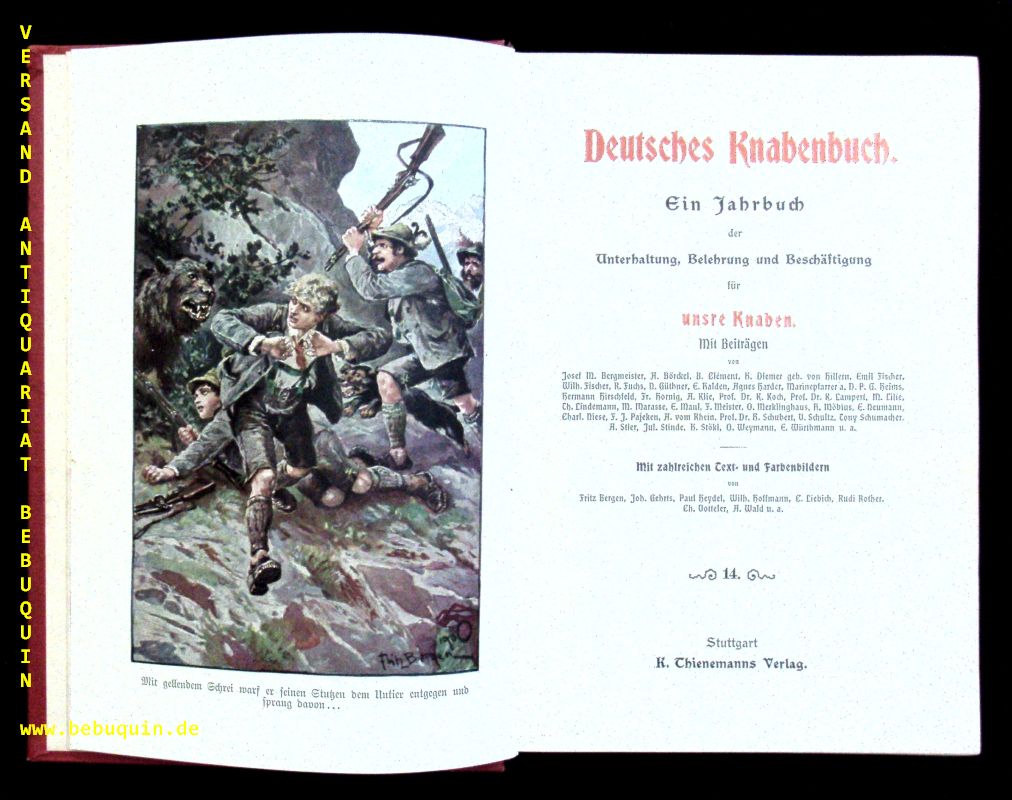 DEUTSCHES KNABENBUCH.– Bd. 14. Ein Jahrbuch der Unterhaltung, Belehrung und Beschäftigung für unsere Knaben. Stuttgart (Thienemann), (1901). Gr. 8°. 400 S. mit zahlr. teils farb. Text- und 6 Farbenbildern von Fritz Bergen, Joh. Gehrts, Heydel, Wald, Chr. Votteler u.a. farb. ill. OLn. oberes Kap leicht geblichen, sonst gut erhalten.