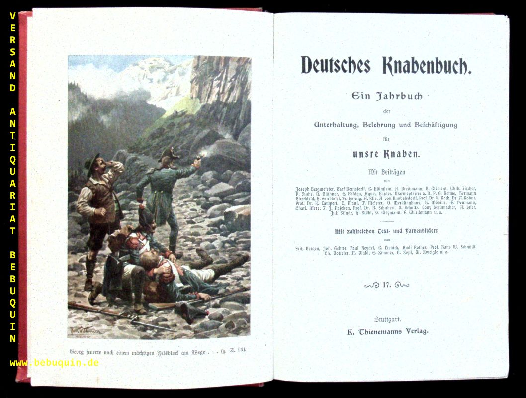DEUTSCHES KNABENBUCH.– Bd. 17. Ein Jahrbuch der Unterhaltung, Belehrung und Beschäftigung für unsere Knaben. Stuttgart (Thienemann), (1904). Gr. 8°. 400 S. mit zahlr. teils farb. Text- und 4 Farbenbildern von Fritz Bergen, Joh. Gehrts, Heydel, Wald, Chr. Votteler u.a. farb. ill. OLn. fliegender Vorsatz fehlt, sonst gut erhalten. Mit Texten von Bergmeister, Clement, Schumacher, Lampert, Möbius, Niese, Pajeken, Stier, Stökl, Weymann u.a.