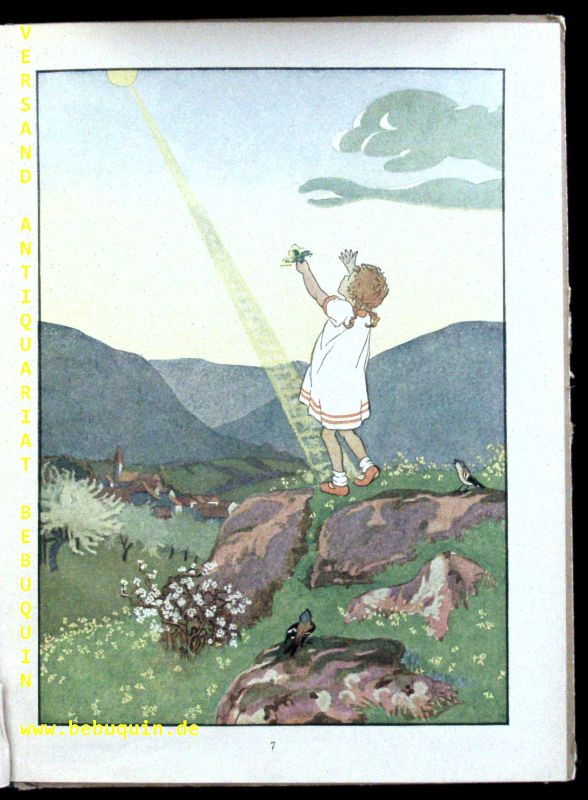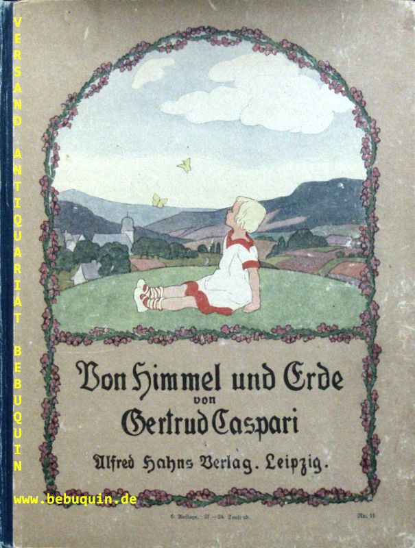 CASPARI.– HOLST, Adolf: Von Himmel und Erde. Bilder mit Geschichten. 6. Aufl. Leipzig (Hahn), (1921). Gr. 4°. 32 S. mit farb. Vorsätzen, farb. Titelzeichnung, farb. Rahmenzeichnung für das Inhaltsverzeichnis, 23 farb. Illustrationen, davon 4 ganzseitig. farb. ill. OHLn. Einband gering berieben, vorderer Vorsatz etwas gelockert, kleine Randläsuren, insgesamt gutes Ex. Verlagsnummer 11. Neubert 22.6.