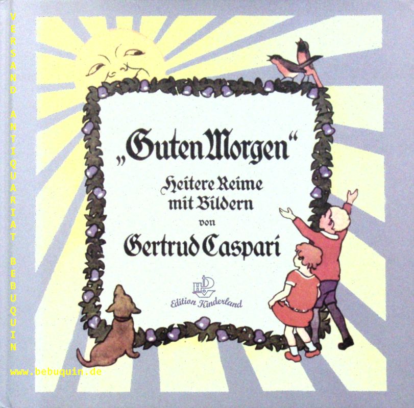 CASPARI, Gertrud: „Guten Morgen“. Heitere Reime mit Bildern. Husum (Husum), 2008. Gr. 8°. 32 (1) S. mit farb. Bildern und gestalteten Vorsatzpapieren von Gertrud Caspari. farb. ill. OPb. Ex libris, sonst wie neu. ohne Auflagenangabe.