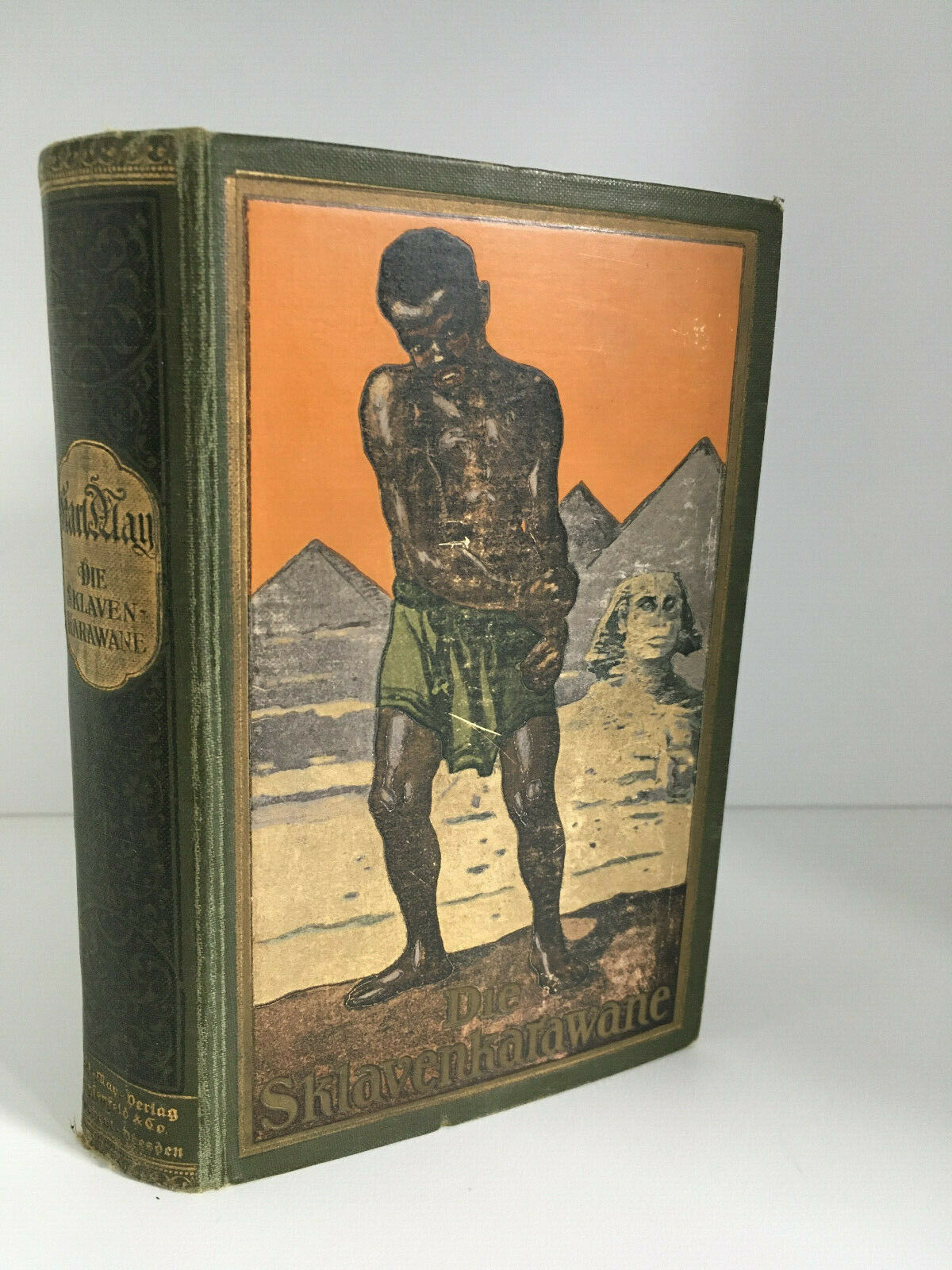 MAY, Karl: Die Slavenkarawane. Erzählung aus dem Sudan. 16.– 22. Tsd. Radebeul (Karl May), (1917). 632 (2) S. farb. ill. OLn. leicht berieben, etwas schief gelesen, noch gutes Ex. = Gesammelte Werke, Bd. 41. sehr seltenen 1. Ausgabe im Radebeul Verlag in Variante T2 mit der Tausendangabe 16.– 22. „Im Jahr 1917 wurden zur Komplettierung einzelne Bogen auf holzfreiem Papier nachgedruckt, so dass auch hh/hf-gemischte Buchblocks vorkommen.“ (so hier) Hermesmeier / Schmatz GW 41.6.
