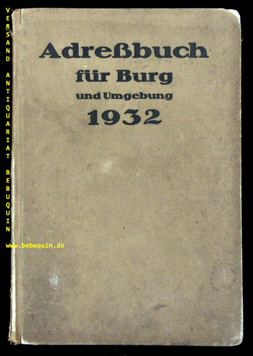 BURG.– EINWOHNER- UND GESCHÄFTSHANDBUCH FÜR BURG UND DIE DÖRFER DER UMGEBUNG 1932.– Burg (Tageblatt), 1932. Gr. 8°. 252 S.+ XXVII S. Werbung. OLn. Kapital angeplatzt, Einband gebräunt, im Werbeteil mit wenigen Einrissen, insgesamt gut erhalten. seltene EA.