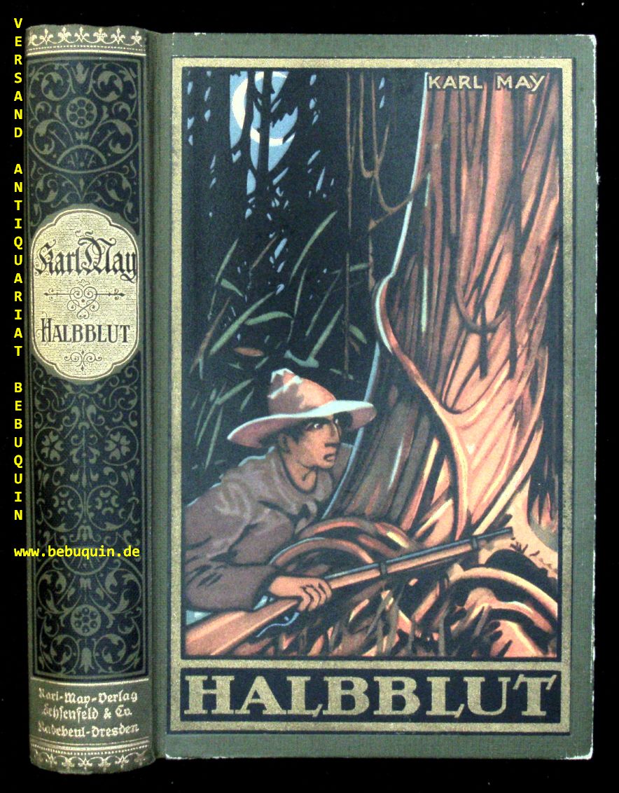 MAY, Karl: Halbblut und andere Erzählungen. Hrsg. von E.A. Schmid. 101.– 108. Tsd. Volksausgabe. Radebeul (Karl May), 1930. 603 (2) S. und rotes Vorsatzpapier. farb. ill. OHLn. NaV, farbstarker Einband, leuchtendes Rückengold, sehr feines Ex. = Gesammelte Werke, Bd. 38. Hermesmeier / Schmatz GW38.11.