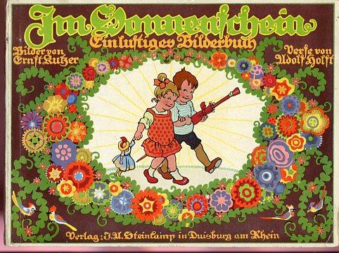 KUTZER.– HOLST, Adolf: Im Sonnenschein. Ein lustiges Bilderbuch. Duisburg (Steinkamp), ca 1920. Quer 4°. 6 unzerbrechliche Bl. mit farb. Illustrationen von Ernst Kutzer. farb. ill. OHLn. Kanten wenig berieben, Ränder leicht angeschmutzt, insgesamt gutes Ex. EA dieses seltenen Kinderbuchs. Nicht bei Blaume, Klotz, Dorerer, Ries und Bunk.