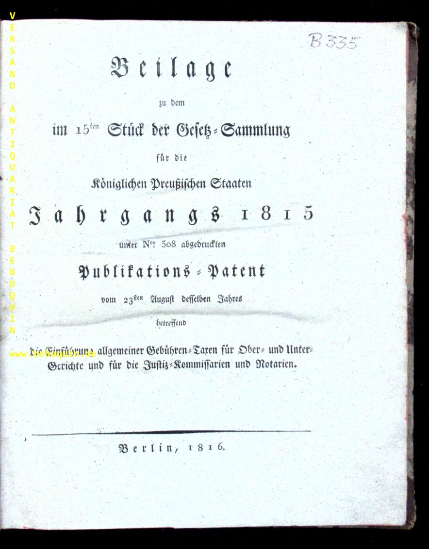 RECHTSWESEN.– PUBLIKATIONS-PATENT: Beilage zu dem im 15ten Stück der Gesetz-Sammlung für die Königlich Preußischen Staaten Jahrgangs 1815 unter Nro. 308 abgedruckten Publikations-Patent vom 23sten August desselben Jahres betreffend die Einführung allgemeiner Gebühren-Taxen für Ober- und Untergerichte und für die Justiz-Kommissarien und Notarien. Berlin, 1816. 4°. 104 S. HLn der Zeit. Rücken abgeblättert, sonst gut erhalten. Enthält eine detaillierten Auflistung der Gebühren-Taxen für sämtliche Landes-Justiz-Kollegia.