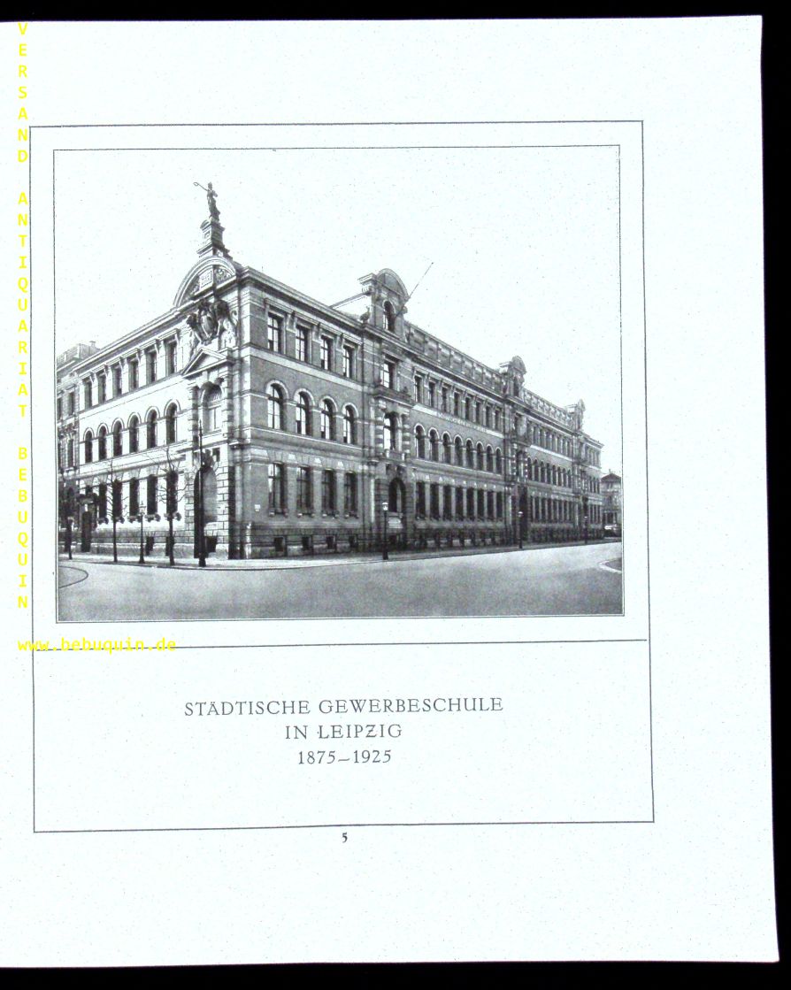 LEIPZIG.– STÄDTISCHE GEWERBESCHULE IN LEIPZIG.– Festschrift zum 50jährigen Jubiläum. 1875 – 1925. Leipzig (Hahn), 1925. 4°. 76 S. mit zahlr. fotografischen Abb. und Bildtafeln. OKart. gutes Ex. seltene EA.