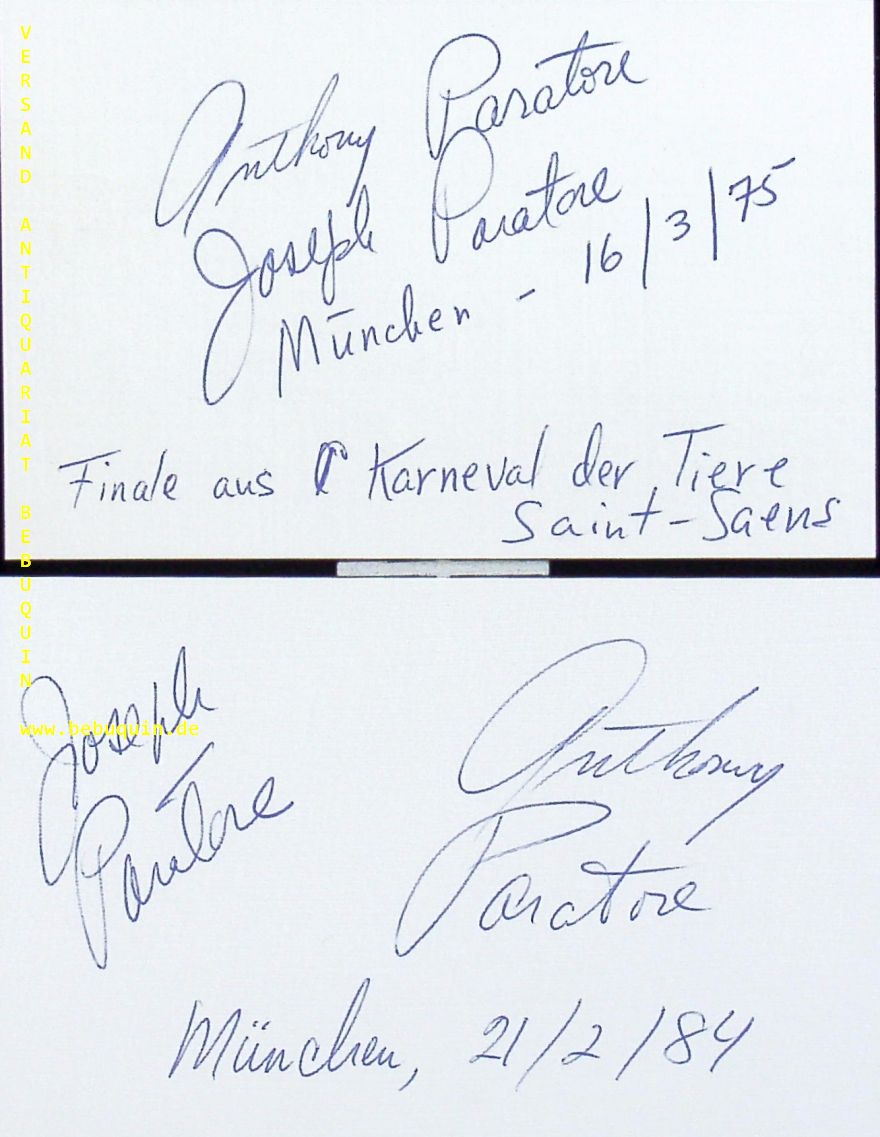PARATORE, Anthony + Joseph (Pianisten): 2 eigenhändig signierte und datierte Autogrammkarten München (Philharmonie), 1975 1984. 8 x 12,5. 2 Karteikarten. Anthony & Joseph Paratore is an internationally known classical piano duo, formed by the brothers Anthony Paratore (born 17 June 1944) and Joseph Paratore (born 19 March 1948). The pianists have performed and recorded most of the classical repertoire for two pianos and four-hand piano, including works with orchestra and arrangements of works for orchestra. In the field of jazz they have collaborated with Dave Brubeck. (Wikipedia)