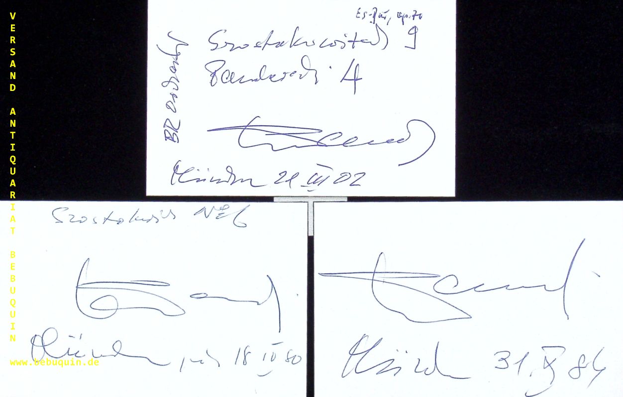 PENDERECKI, Krzyztof (Komponist): 3 eigenhändig signierte und datierte Autogrammkarten München, 1980 – 2002. 8 x 12,5 cm. 3 Karteikarten. Krzysztof Eugeniusz Penderecki (* 23. November 1933 in Debica; † 29. März 2020 in Krakau) war ein zeitgenössischer polnischer Komponist, dessen Werk der postseriellen Musik zugeordnet wird und der vor allem durch seine Klangkompositionen Aufsehen erregte. Für diese speziell in der Instrumentalmusik angewandte Technik wurde von Seiten der polnischen Musikwissenschaft, namentlich von Zofia Lissa und Józef Michal Chominski, der Begriff Sonorismus entwickelt. Er gilt als einer der führenden Komponisten der polnischen Avantgarde, der mit seiner Musik „den Kompositionsstil einer ganzen Ära der zeitgenössischen Musik mitgeprägt“ hat. Sein unerschrockenes Eintreten für christliches Gedankengut und Menschlichkeit sowie seine unverwechselbare Tonsprache ließen Penderecki zur Galionsfigur einer „polnischen Schule“ der Avantgarde werden. (Wikipedia)