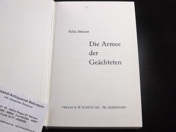 2. WELTKRIEG.– STEINER, Felix: Die Armee der Geächteten. 4. Aufl. Oldendorf (Schütz). 1972. 352 S.+ zahlr. Bildtafeln OLn fliegender Vorsatz fehlt.