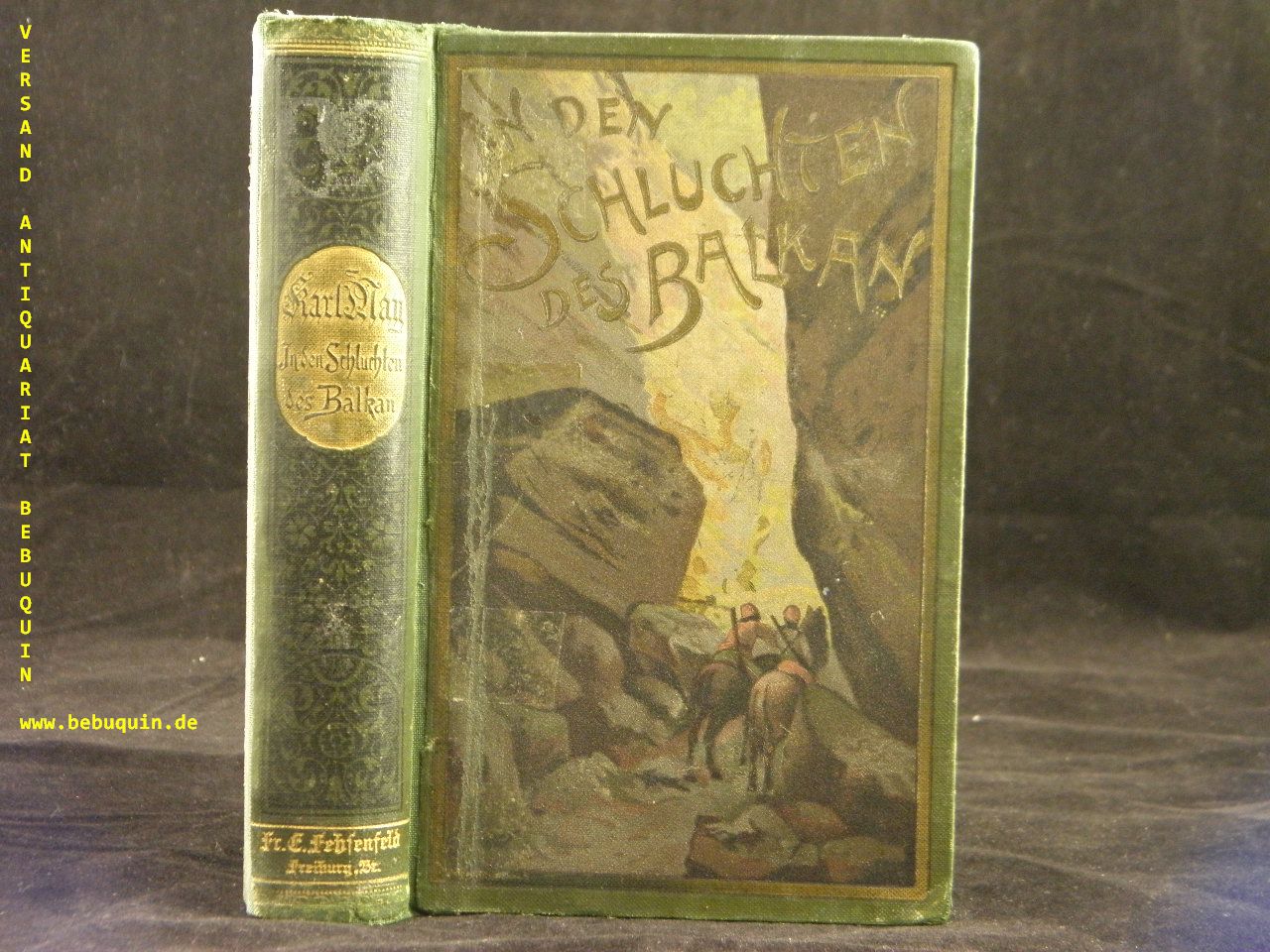 MAY, Karl: In den Schluchten des Balkan. Reiseerlebnisse. 41.– 45. Tsd. Freiburg (Fehsenfeld), (1906). 607 (4) S. farb. ill. OLn. Plaul 44. alter Rücken neu aufgezogen, Einband etwas angeschmutzt, Ex libris auf Innendeckel. = Gesammelte Reiseromane, Bd. IV. Frühe Buch-Ausgabe. Plaul 232.4.