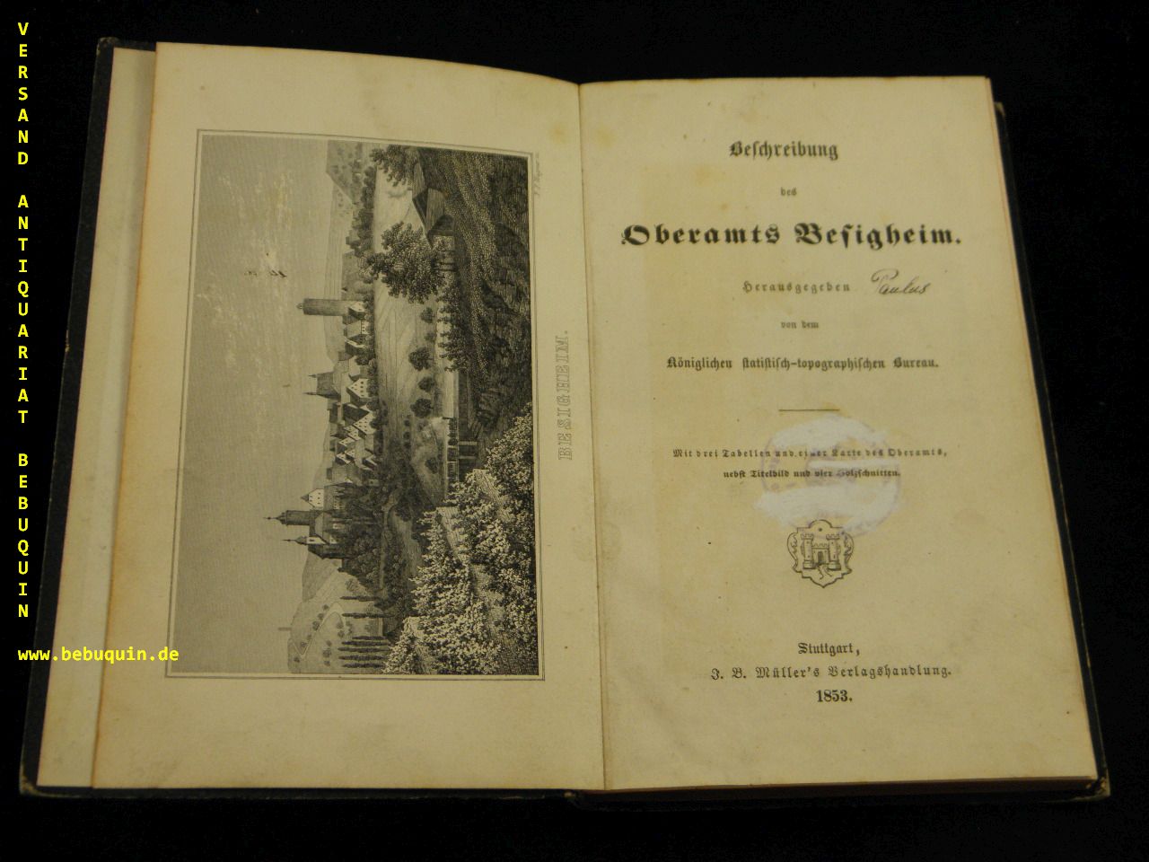 BESIGHEIM.– BESCHREIBUNG DES OBERAMTS BESIGHEIM.– Hrsg. vom Königlichen statistisch-topographischen Bureau. Stuttgart (Müller), 1853. 308 S. mit 1 Titelstich, einer Ansicht von Laufen, 3 Tabellen und einer Faltkarte. Pb der Zeit. StaT teils gelöscht, insgesamt von guter Erhaltung. EA.