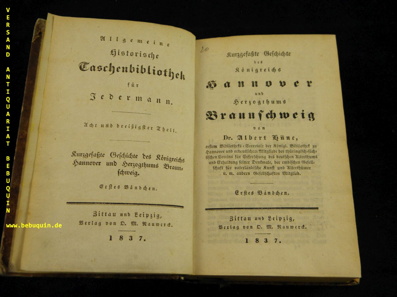 HANNOVER.– HÜNE, Albert: Kurzgefaßte Geschichte des Königreichs Hannover und Herzogthums Braunschweig. 3 Bände in 1 Bd. Zittau, Leipzig (Nauwerck), 1837-40. kl. 8°. 245, 247, 200 S. Pb der Zeit mit goldgeprägtem Lederrückenschild. Kanten leicht berieben, sonst gutes Ex. = Allgemeine historische Taschenbibliothek für Jedermann, 38. Theil. EA.