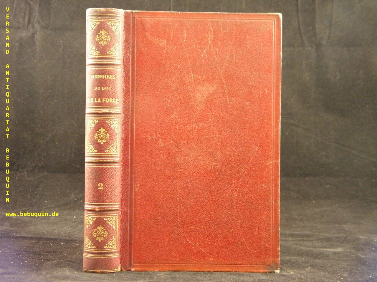 GRANGE, Marquis de la: (Hrsg.) Mémoires authentiques de Jacques Nompar de Caumont, duc de La Force, maréchal de France, et de ses deux fils les marquis de Montpouillan et de Castelnaut. Suivis de Documents curieux et de Correspondances inédites de Jeanne d’Albret, Henri III, Henri IV, Catherine de Bourbon, Louis XIII, Marie de Médicis, Condé, Sully, Villeroy, Fresnes, Pontchartrain, Bouillon, Biron, d’Ornano, Montespan, Matignon, du Plessis-Mornay, Rohan, Schomberg, Châtillon, d’Effiat, Feuquières, Richelieu. Pour faire suite à toutes les collections de mémoires sur l’histoire de France. Tome II (von 4). Paris (Charpentier), 1843. Gr. 8°. 592 S. rotes OHLdr mit goldgeprägtem Rücken. schönes Ex. 1. Aufl. dieser Ausgabe. Jacques Nompar de Caumont (* 30. Oktober 1558; † 10. Mai 1652) war Seigneur, Marquis, 1. Herzog von La Force, Pair von Frankreich, außerdem Gouverneur von Béarn, Vizekönig von Navarra[1] unter König Heinrich IV. sowie Maréchal de France unter König Ludwig XIII. Er hinterließ umfangreiche Memoiren.