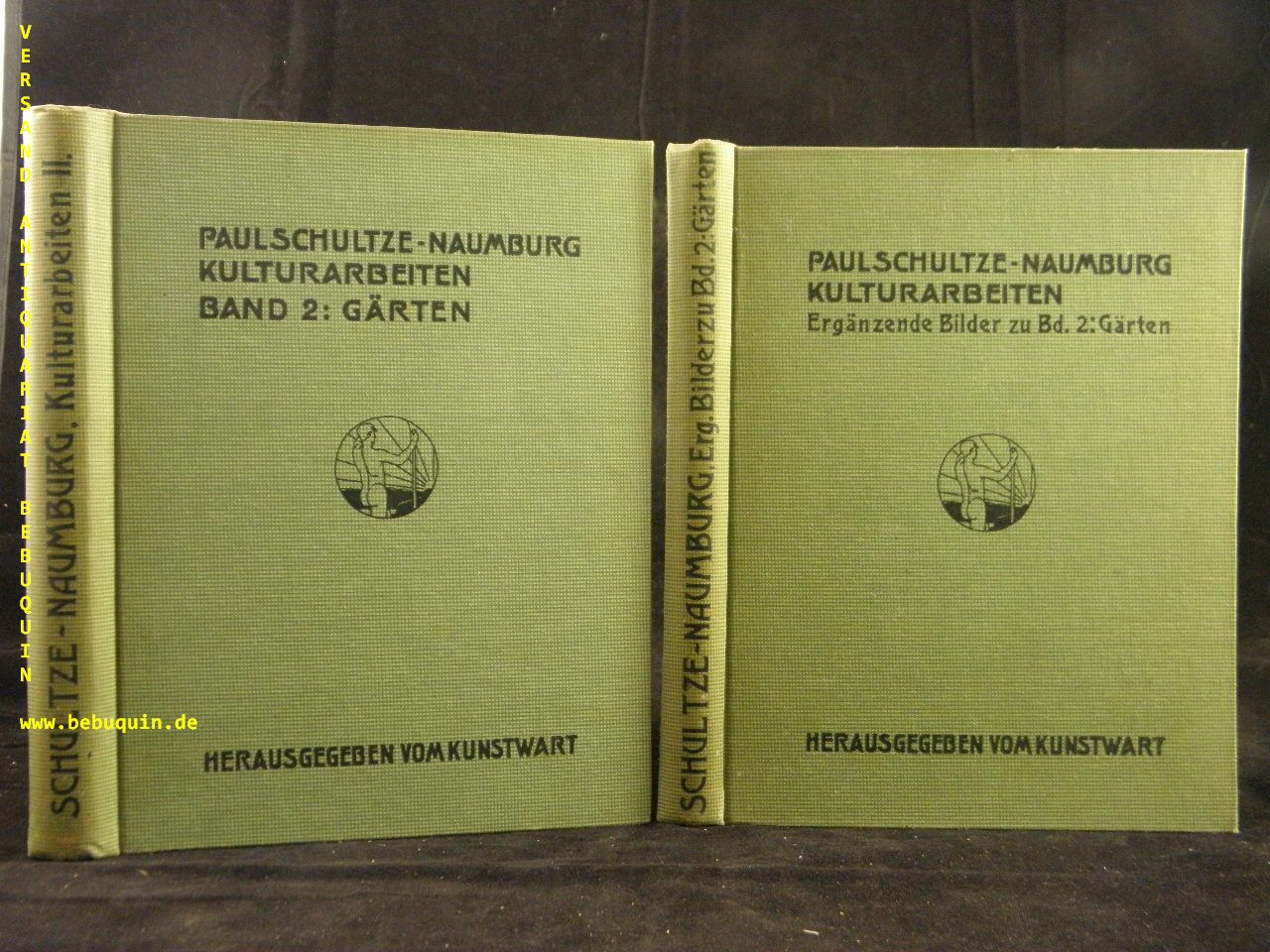ARCHITEKTUR.– SCHUTZE-NAUMBURG, Paul: Gärten. + Ergänzende Bilder zu Gärten. 3. bzw. 2. vermehrte Aufl. 2 Bände. München (Callwey), 1909 bzw 1910. 4 Bl., 304 S., 2 Bl. mit 185 Abb. + 10 S., 100 Tafeln, 2 Bl. OLn. WaV, die Bildtafeln im Ergänzungsband handschriftlich untertitelt, sonst gutes Ex. = Kulturarbeiten, Bd. II.
