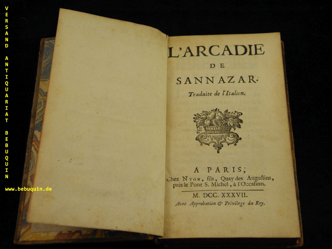 SANNAZARO, Jacopo: L’Arcardie. Traduite de l’Italien. Paris (Nyon fils), 1737. kl. 8°. XX, 226 (2) S. mit mehreren gestochenen Kopf- und Endvignetten. OLdr mit goldgeprägtem Rücken und marmorierten Vorsätzen. 2 kleine Ex libris auf Innendeckel, schönes Ex. 1. Aufl. dieser frühen (ersten?) französischen Ausgabe. Arcadia ist eine Schäferdichtung von Jacopo Sannazaro. Er schrieb diese etwa um 1480, die endgültige Fassung wurde erstmals 1504 in Neapel veröffentlicht. Mit seiner italienischen Arcadia hat Sannazaro die Literatur des 16. und 17. Jahrhunderts (Shakespeare, Philip Sidney, Margarete von Navarra, John Milton) nachhaltig beeinflusst. (Wikipedia).