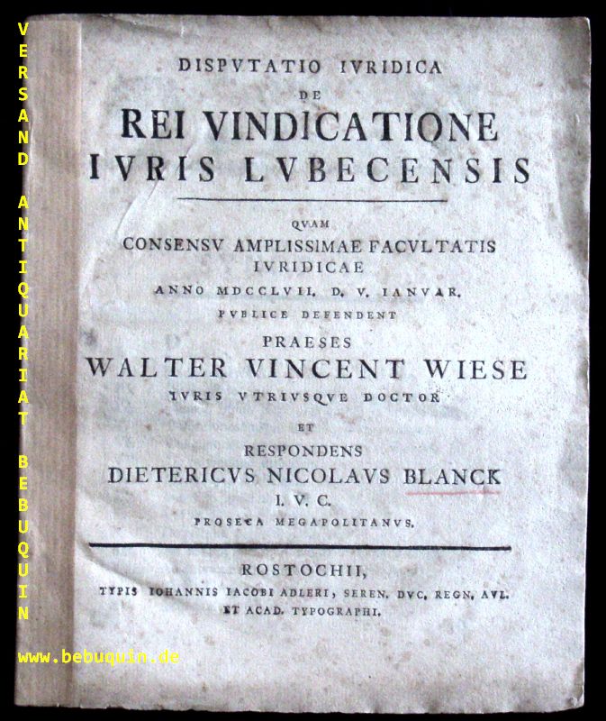BLANCK, Juristische Disputation. De rei vindicatione iuris Lubecensis.