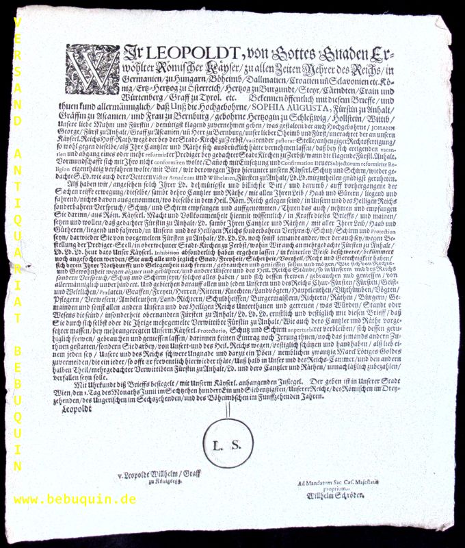 LEOPOLD I..– PATENT FÜR SCHUTZ UND SCHIRM DER SOPHIA AUGUSTA / FÜRSTIN VON ANHALT.– Vom 16. Juni 1671. o.O., 1671. 40 x 33 cm. 50zeiliger einseitig bedruckter Bogen Hadernbütten mit gestochener Majuskel und LS-Zeichen. im DRuck unterzeichnet neben Leopold von Wilhelm Schröder und Graff zu Königsegg. mittig gefaltet, gutes dekoratives Ex. Leopold I. (* 9. Juni 1640 in Wien; † 5. Mai 1705 ebenda), VI. aus dem Hause Habsburg, geboren als Leopold Ignaz Joseph Balthasar Franz Felician, war von 1658 bis 1705 Kaiser des Heiligen Römischen Reiches sowie König in Germanien (ab 1654), Ungarn (ab 1655), Böhmen (ab 1656), Kroatien und Slawonien (ab 1657). Machtpolitisch stand seine Regierungszeit im Westen ganz im Zeichen der Abwehr der französischen Expansion unter Ludwig XIV. Im Südosten wurden die habsburgischen Territorien zunächst noch durch die osmanische Expansion, mit dem Höhepunkt der Zweiten Belagerung der Stadt Wien, bedroht. Die kaiserlichen Feldherren waren letztlich militärisch erfolgreich und es kam zu einer Gegenoffensive, die zum Gewinn ganz Ungarns führte. Dadurch wuchs der Habsburger Machtbereich noch stärker als zuvor über das Heilige Römische Reich hinaus. Leopolds Regierungszeit gilt daher auch als Beginn der Großmachtstellung der Habsburgermonarchie. Innenpolitisch setzte Leopold in den Habsburger Ländern auf einen absolutistischen Herrschaftsstil. In seine Zeit fällt auch ein letzter Höhepunkt der Gegenreformation. Im Reich dagegen trat er als Bewahrer des Ausgleichs der Konfessionen auf. Durch eine geschickte Politik gelang es ihm, das Kaisertum zum letzten Mal zu einer starken Bedeutung zu führen. Der Tod des letzten spanischen Königs aus dem Haus Habsburg Karl II. führte zum Spanischen Erbfolgekrieg, in dem Leopold die Erbfolge seiner Familie vertrat.