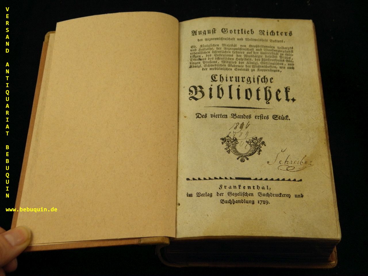 MEDIZIN.– RICHTER, August Gotlieb: Richters Chirurgische Bibliothek. Des vierten Bandes Erstes bis Viertes Stück. Mit zweiseitige Druckerlaubnis von Kaiser Joseph dem Anderen von 1786 für Ludwig Bernhard Friedrich Gegel, Buchdrucker zu Frankenthal, zum Nachdruck der einflußreichen Zeitschrift. 4 Stücke in 1 Bd. Frankenthal (Gegel), 1789. kl. 8°. 3 Bl., 786, 21 S. mit Titelvignetten und Kopfvignette sowie 1 Falttafel späteres HLdr mit Rückenschild. Rückenschild berieben, sonst feines Ex. EA des vielseitigen und bedeutenden deutschen Chirurges. Enthält den Artikel des Königl. Dänischen Hofmedikus Johann Clemens Tode: „Vom Tripper“.