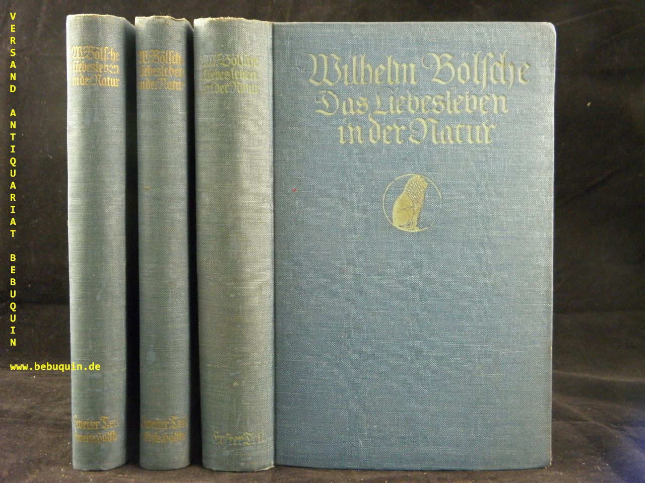 BÖLSCHE, Wilhelm: Das Liebesleben in der Natur. Eine Entwicklungsgeschichte der Liebe. 2 Teile in 3 Bänden. Jena (Diederich), 1921. X, 561, 756 S. OLn mit goldgeprägtem Titel. Rücken etwas geblichen.