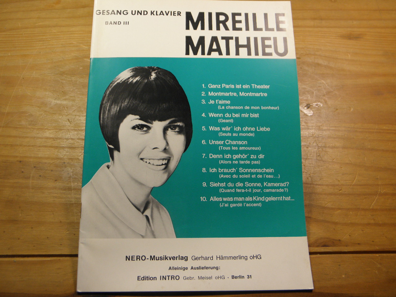 SONGBOOKS.– MATHIEU, Mireille: Band III. Gesang und Klavier. Berlin (Nero), 1970. 4°. 30 S. mit Noten. ill. OKart. gutes Ex. EA. Inhalt siehe Foto.