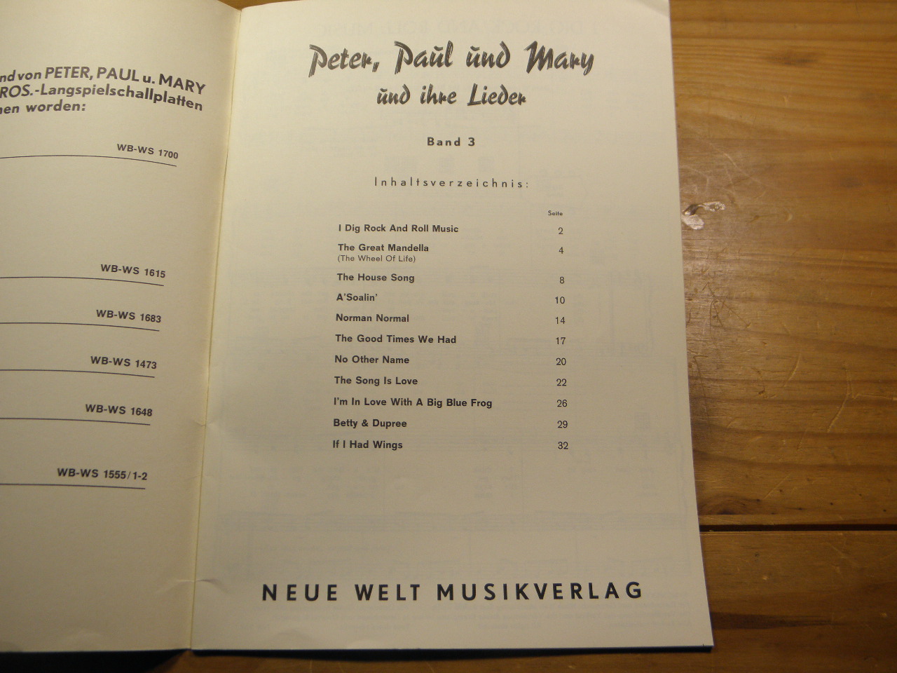 SONGBOOKS.– PETER, PAUL UND MARY: und ihre Lieder. Band 3. Gesang und Klavier. Berlin (Neue Welt), 1970. 4°. 32 S. mit Noten. ill. OKart. gutes Ex. EA. Inhalt siehe Foto.