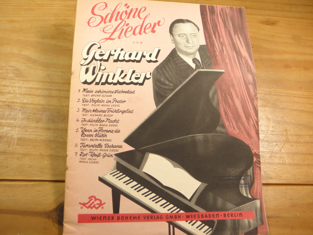 SONGBOOKS.– WINKLER, Gerhard: Schöne Lieder. Gesang und Klavier. Wiesbaden (Wiener Boheme), ca 1945. 4°. 18 S. mit Noten. ill. OKart. gutes Ex. EA. Inhalt siehe Foto.