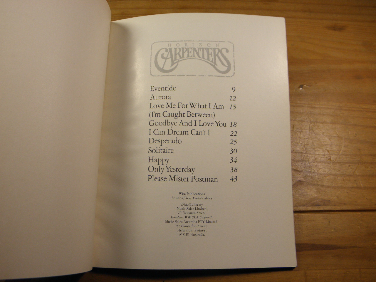 SONGBOOKS.– CARPENTERS: Horizon. Gesang und Klavier. London (Wise), 1975. 4°. 48 S. mit Noten und Bildern. ill. OKart. gutes Ex. EA. Inhalt siehe Foto.