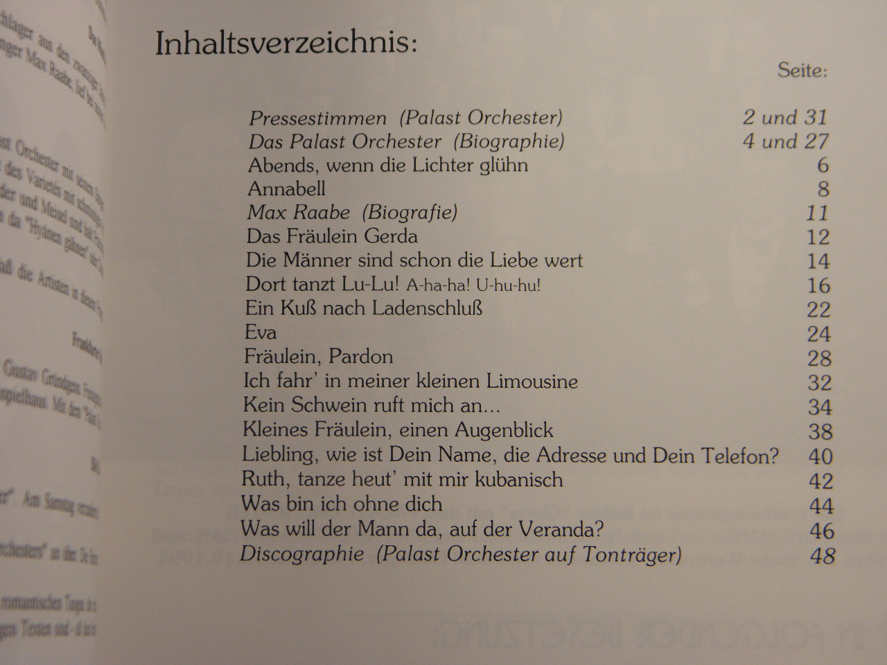 SONGBOOKS.– DAS PALAST ORCHESTER MIT MAX RAABE: Die grossen Erfolge. Songbook. Klavier und Gesang. Berlin (Meisel), 1994. 4°. 48 S. mit Noten und Bildern. ill. OKart. gutes Ex. EA. Inhalt siehe Foto.