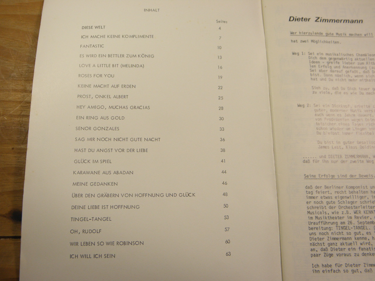 SONGBOOKS.– ZIMMERMANN, Dieter: Komponistenportrait. Klavier und Gesang. Berlin (Intro), 1971. 4°. 66 S. mit Noten und Bildern. ill. OKart. gutes Ex. EA. Inhalt siehe Foto.