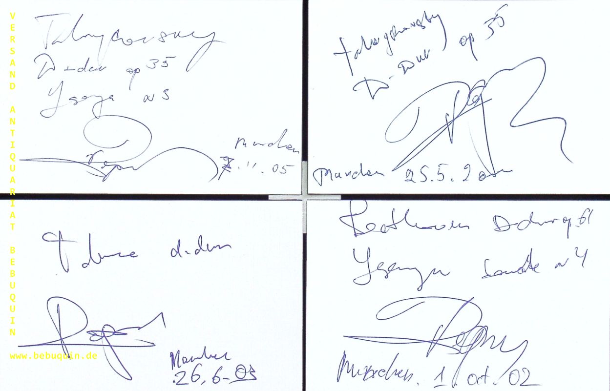 REPIN, Vadim (Violinist): 4 eigenhändig signierte und datierte Autogrammkarten. München (Herkulessaal), 2002 – 2006. 8 x 12,5 cm. 4 Karteikarten. Vadim Repin (* 31. August 1971 in Nowosibirsk) ist ein russischer Violinist und lebt in Wien. Yehudi Menuhin sagte über Vadim Repin: „Er ist einfach der beste und perfekteste Violinist, den ich jemals hören durfte.“. (Wikipedia)