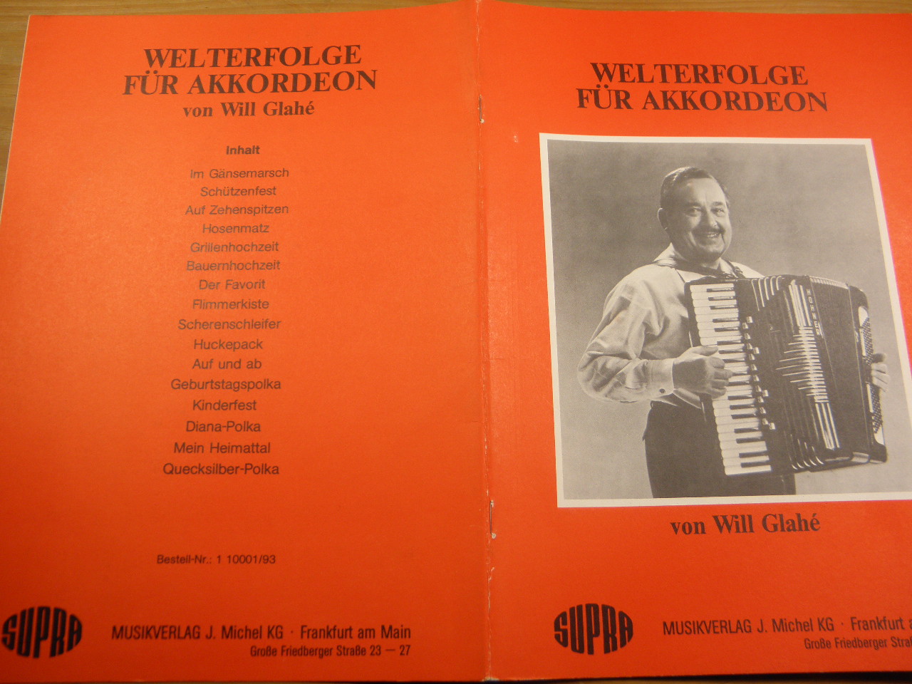 LIEDERBÜCHER.– GLAHE, Will: Welterfolge für Akkordeon. Für Klavier und Gesang. Frankfurt (Michel), 1979. 4°. 32 S. mit Noten. ill. OKart. gutes Ex. EA. Inhalt siehe Foto.