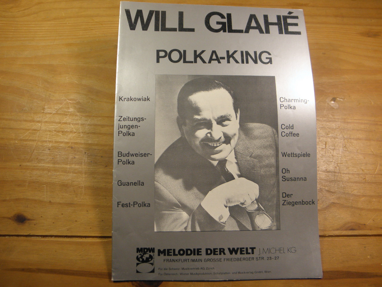 LIEDERBÜCHER.– GLAHE, Will: Polka-King. Für Klavier und Gesang. Frankfurt (MDW), 1973. 4°. 22 S. mit Noten. ill. OKart. gutes Ex. EA. Inhalt siehe Foto.