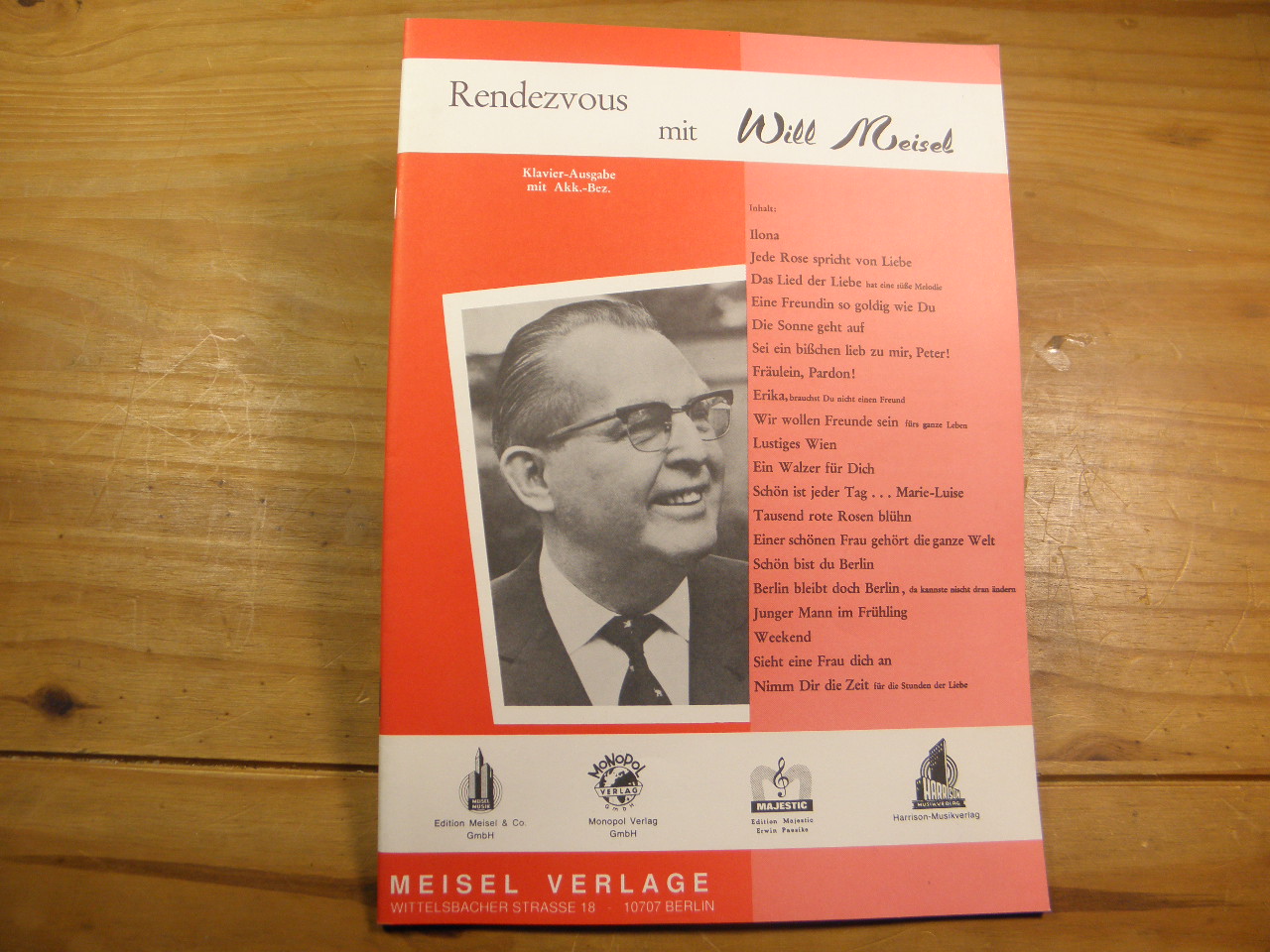 SONGBOOKS.– MEISEL, Willy: Rendezvous. Klavier-Ausgabe mit Akk.-Bez. Berlin (Meisel), ca 1970. 4°. 50 S. mit Noten. ill. OKart. gutes Ex. EA. Inhalt siehe Foto.