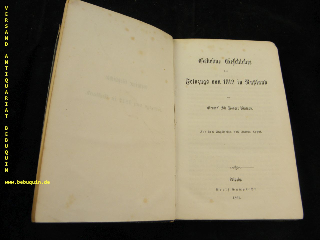 RUSSLAND.– WILSON, Robert: Geheime Geschichte des Feldzugs von 1812 in Rußland. D.v. Julius Seybt. Leipzig (Gumprecht), 1861. 339 S. Pb der Zeit mit goldgeprägtem Rücken. Kanten berieben, wenige Anstreichungen. seltene dt. EA.