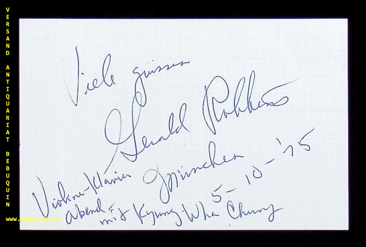 ROBBINS, Gerald (Pianist): eigenhändig signierte und datierte Autogrammkarte. München (Philharmonie), 5.10.2015. 8 x 12,5 cm. Karteikarte. Pianist Gerald Robbins has distinguished himself internationally as a soloist and chamber musician, having performed throughout the world in virtually every major music center including New York, London, Paris, Amsterdam, Bonn, Munich, Athens, Frankfurt, Belgrade, Moscow, St. Petersburg, Rio de Janeiro, Tel-Aviv, Jerusalem, Taipei, Hong Kong, Shanghai, and Tokyo.