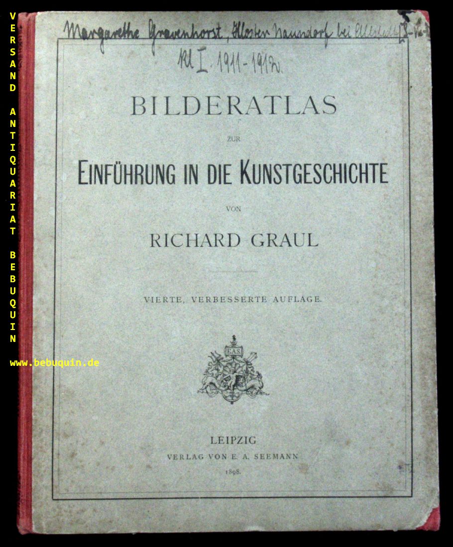GRAUL, Richard: Bilderatlas zur Einführung in die Kunstgeschichte. 4. verbesserte Aufl. Leipzig (Seemann), 1898. Gr. 4°. 2 Bl. + 104 Bildtafeln. OHLn. NaU, NaV, Gelenke etwas gelockert.