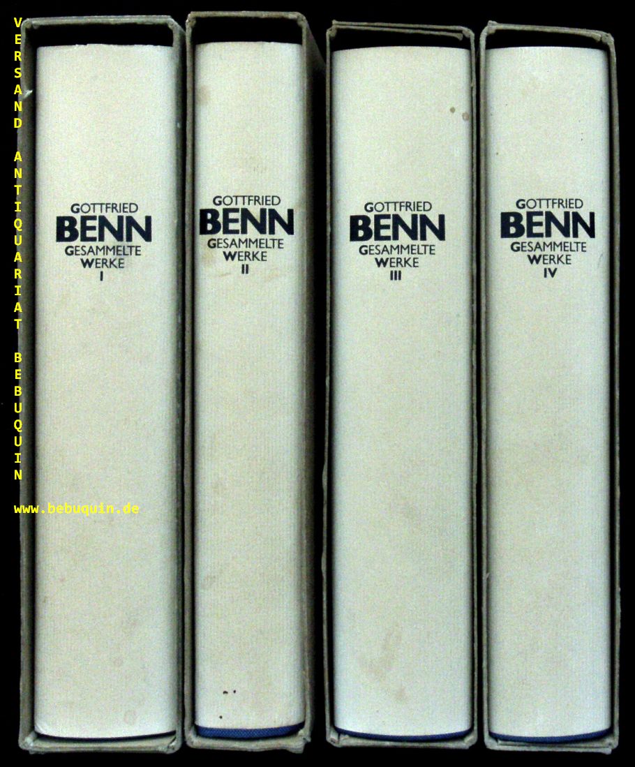BENN, Gottfried: Gesammelte Werke. Herausgegeben von Dieter Wellershoff. 6.+ 7. Aufl. 4 Bände. Wiesbaden (Limes), 1987/89. ca 2000 S. OLn mit OUmschl sowie OSchuber. ein Schnitt mit kleinem Fleck, ein NaV, sonst tadellos. Die gesuchte Werkausgabe des Dichterarztes in einem feinen Exemplar.