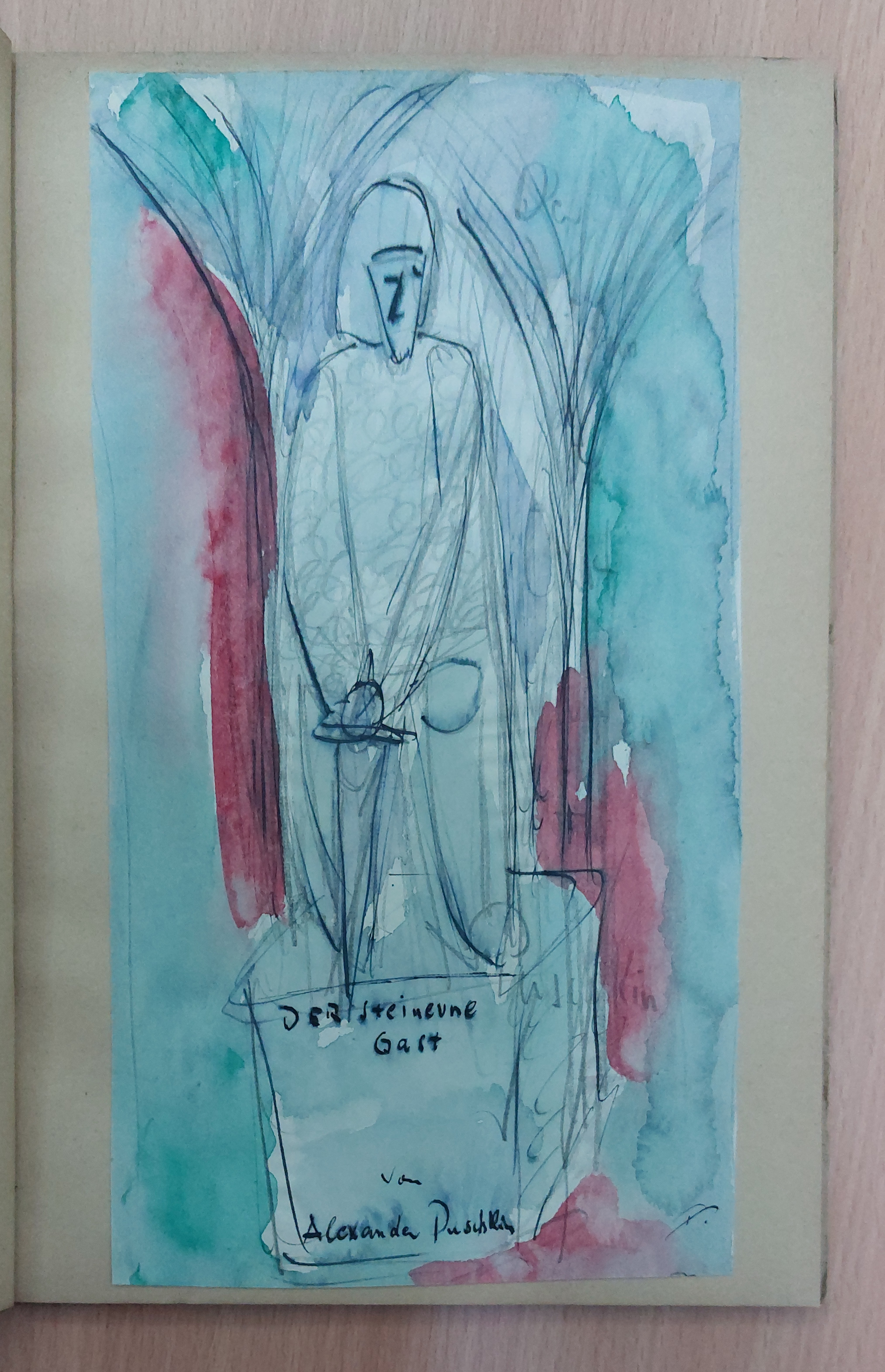 EBERZ.– PUSCHKIN, Alexander: Das steinerne Gast. D.v. Johannes von Guenther. München (Orchis), 1923. Gr. 8°. 41 S. mit 9 Zeichnungen und 8 handkolorierte ganzseitigen O.-Lithos v. Josef Eberz. ill. OKart. Einbandrand leicht gebräunt, sonst sehr feines getrüffeltes Ex. EA mit einer mont. aquarellierten Strichzeichnung von Eberz verso Druckvermerk montiert, wohl ein Entwurf für die geplante Einbandillustration. Ein Unikat.
