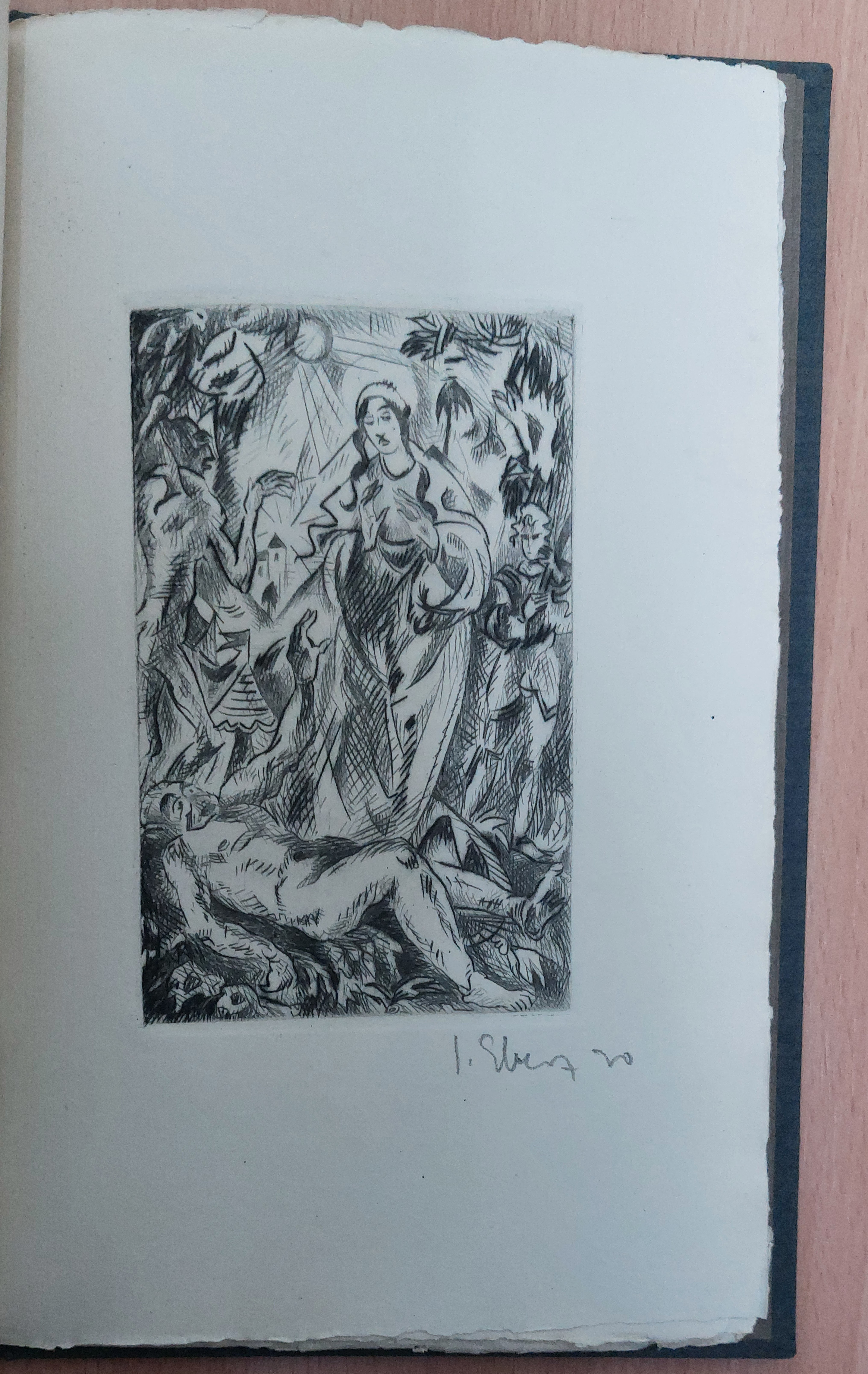 EBERZ.– HEINE, Heinrich: Vitzliputzli. München (Mandruck), 1922. 20 Bl. Bütten mit 4 eigenhändig signierten Originalradierungen von Josef Eberz. Ln mit goldgeprägtem Deckelschild. tadelloses Ex. = Dritter Druck der Serapionsbrüder. 1 von 150 Ex.