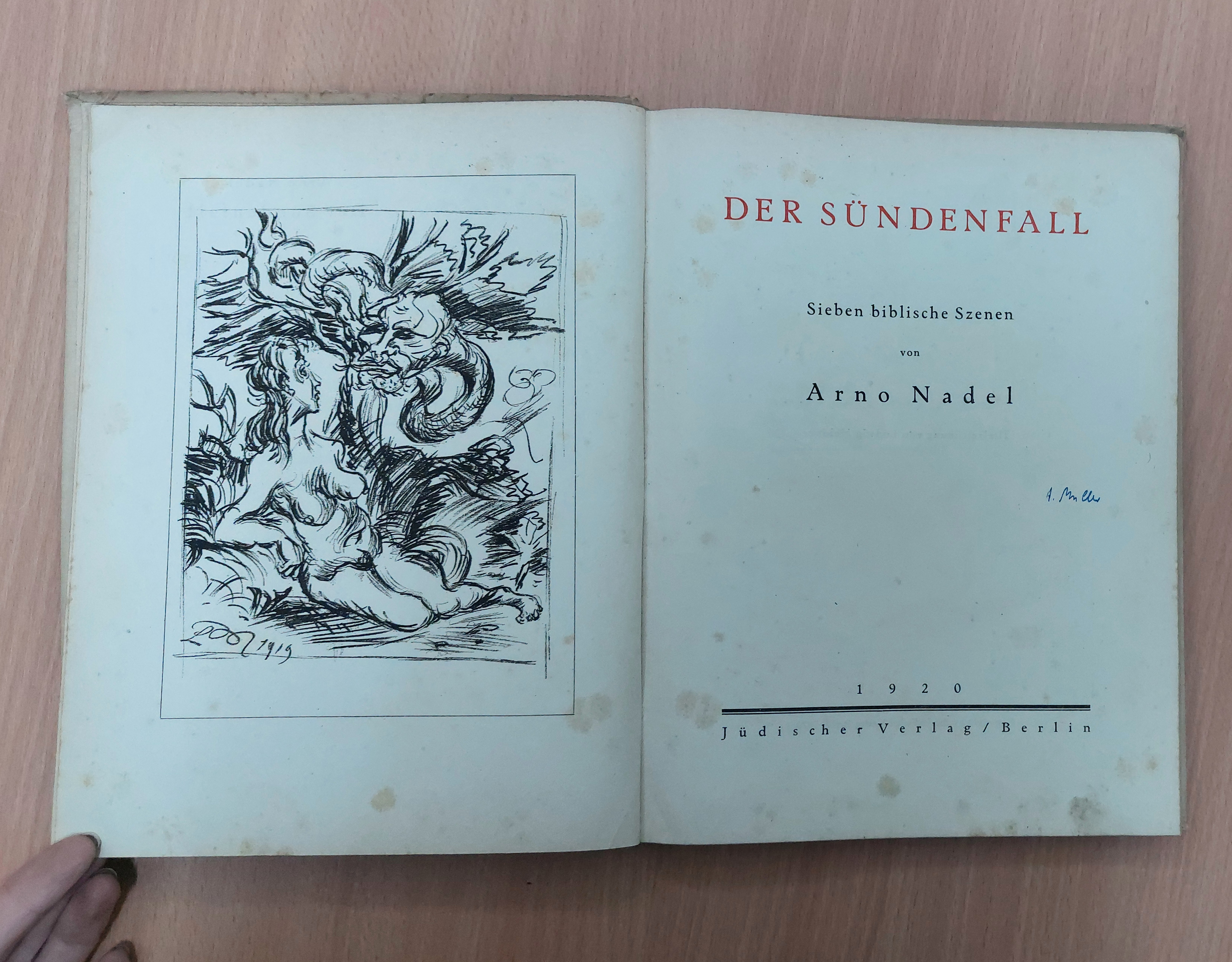 MEIDNER.– NADEL, Arno: Der Sündenfall. Sieben biblische Szenen. Berlin (Jüdischer); 1920. Gr. 8°. 103 S. mit der Titelzeichnung von Ludwig Meidner. OPb. gelenke gelockert, Ecken bestoßen, sonst ordentlich. EA.