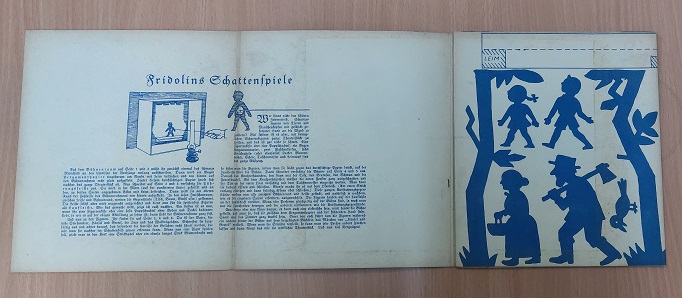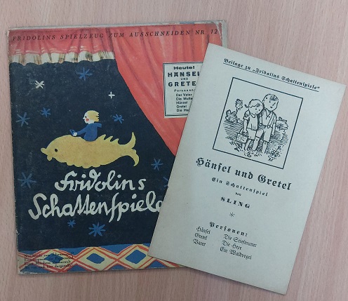 SLING: (D.i. Paul Schlesinger) Hänsel und Gretel. Fridolins Schattenspiele. Mit der Beilage. Berlin (Fridolin), ca 1925. 17 x 19,5 cm. 6 Bl. Leporello mit den plastischen Figuren zum Ausschneiden + 15 S. Beilage. farb. ill. OKart. etwas bestaubt, sonst von spektakulärer Erhaltung. = Fridolins Spielzeug zum Ausschneiden Nr. 12.