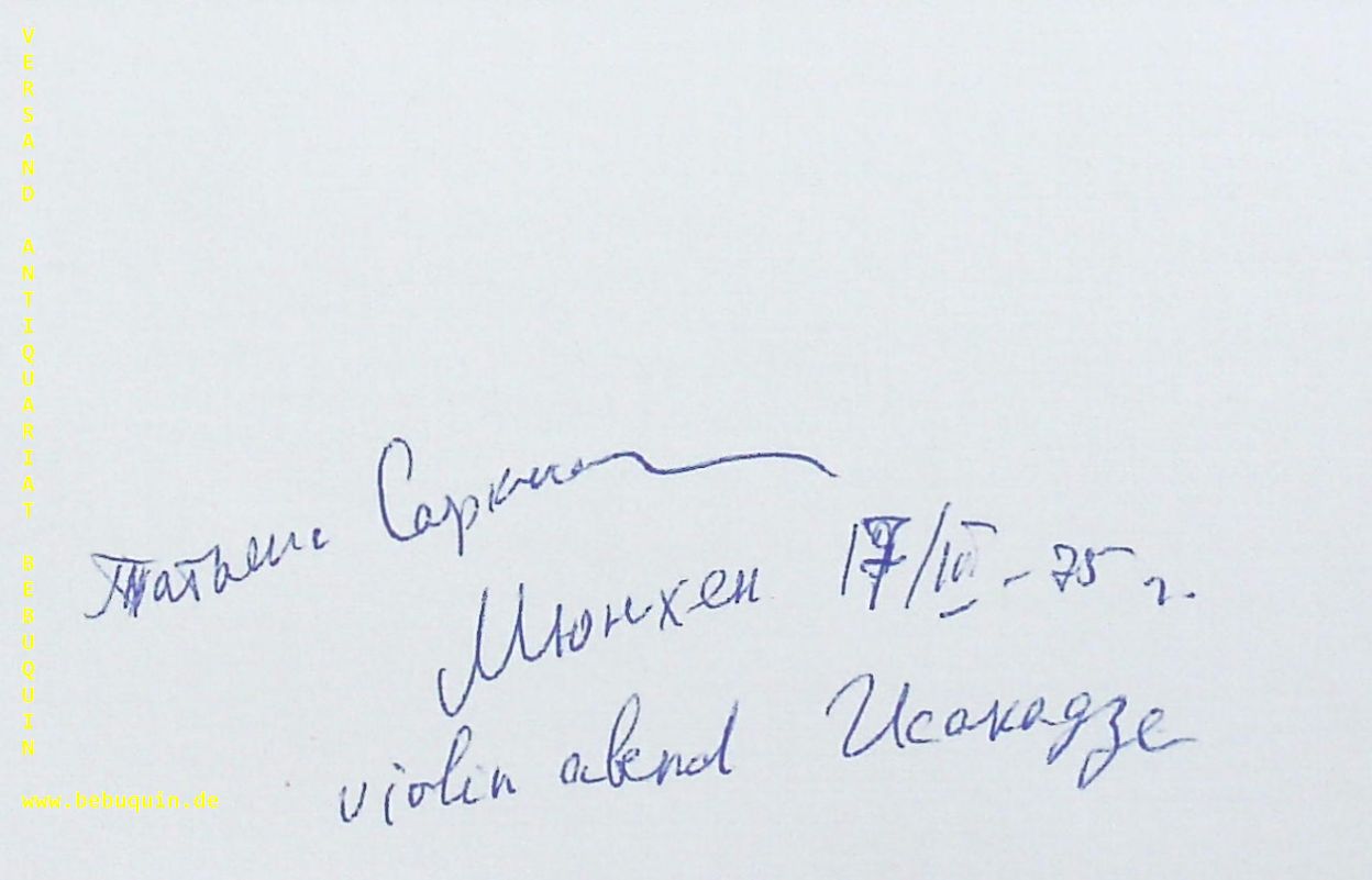 SARKISOWA, Tatjana (Pianistin): eigenhändig signierte und datierte Autogrammkarte. München (Herkulessaal), 17.3.1975. 8 x 12,5 cm. Karteikarte.