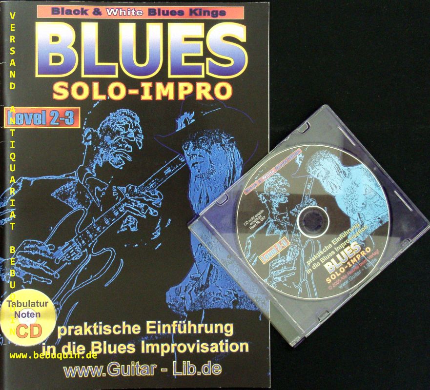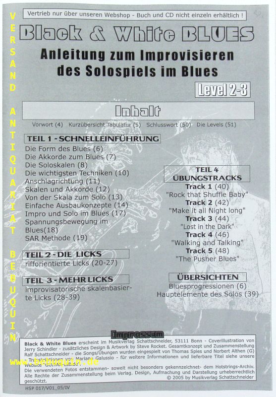 SONGBOOKS.– BLACK & WHILE BLUES.– Anleitung zum Improvisieren des Solospiels im Blues. Level 2 – 3. Bonn (Schattschneider), 2005. 4°. 50 S. mit Noten, Bildern und der Tabulatur Noten CD.. ill. OKart. gutes Ex. EA.