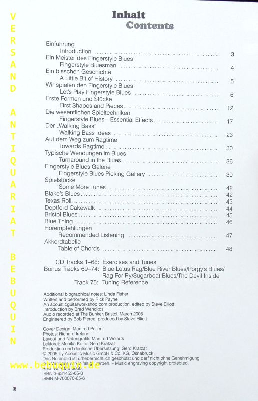 SONGBOOKS.– PAYNE, Rick: Fingerstyle Blues. Learn Acoustic Blues now. Osnabrück (Acoustic), 2005. 4°. 48 S. mit Noten, Bildern und der CD „Learn to play Jinim Hendrix“. ill. OKart. gutes Ex. EA.