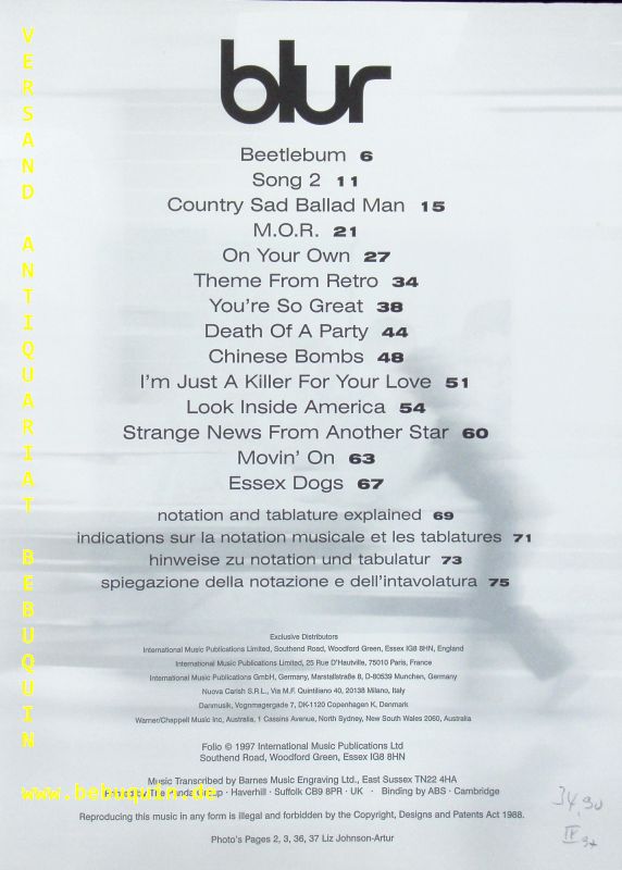SONGBOOKS.– BLUR: The man who. Songbook mit Guitar tablature. Für Voice, Piano und Gitarre. Woodford Green (IMP), 1997. 4°. 76 S. mit Noten und Bildern farb. ikll. OKart. gutes Ex.