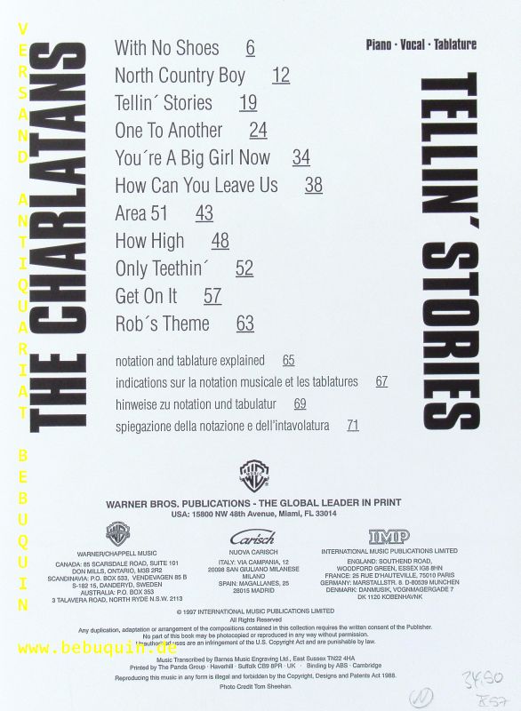 SONGBOOKS.– THE CHARLATANS: Tellin’ Stories. Songbook mit Guitar tablature. Für Voice, Piano und Gitarre. Miami (Warjner), 1997. 4°. 72 S. mit Noten und Bildern. farb. ill. OKart. gutes Ex. EA.